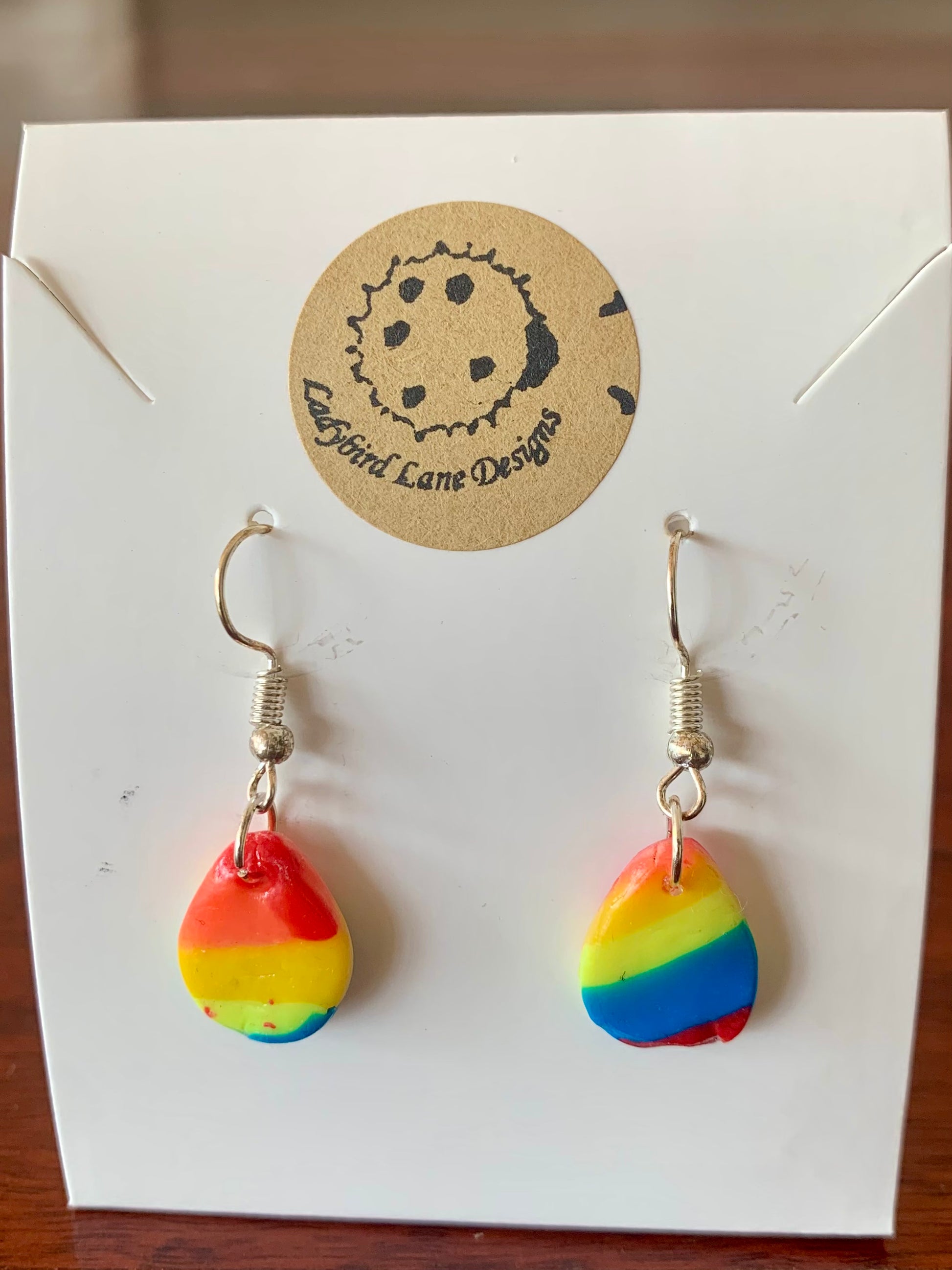Rainbow, marble style hook earrings – mini teardrop shape.